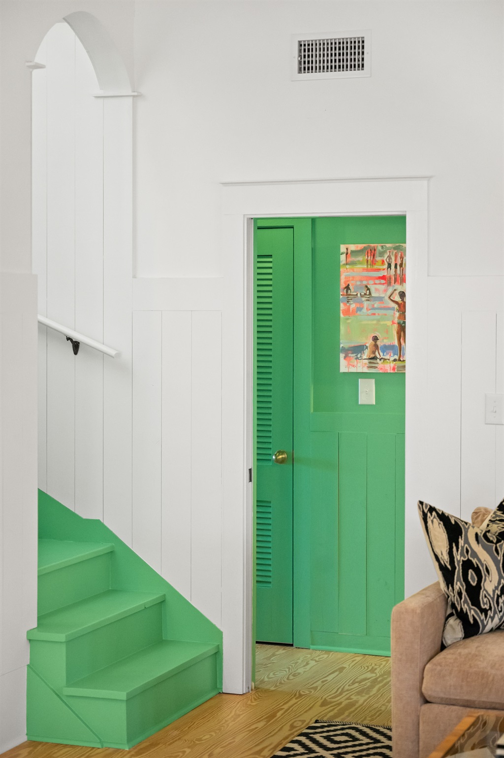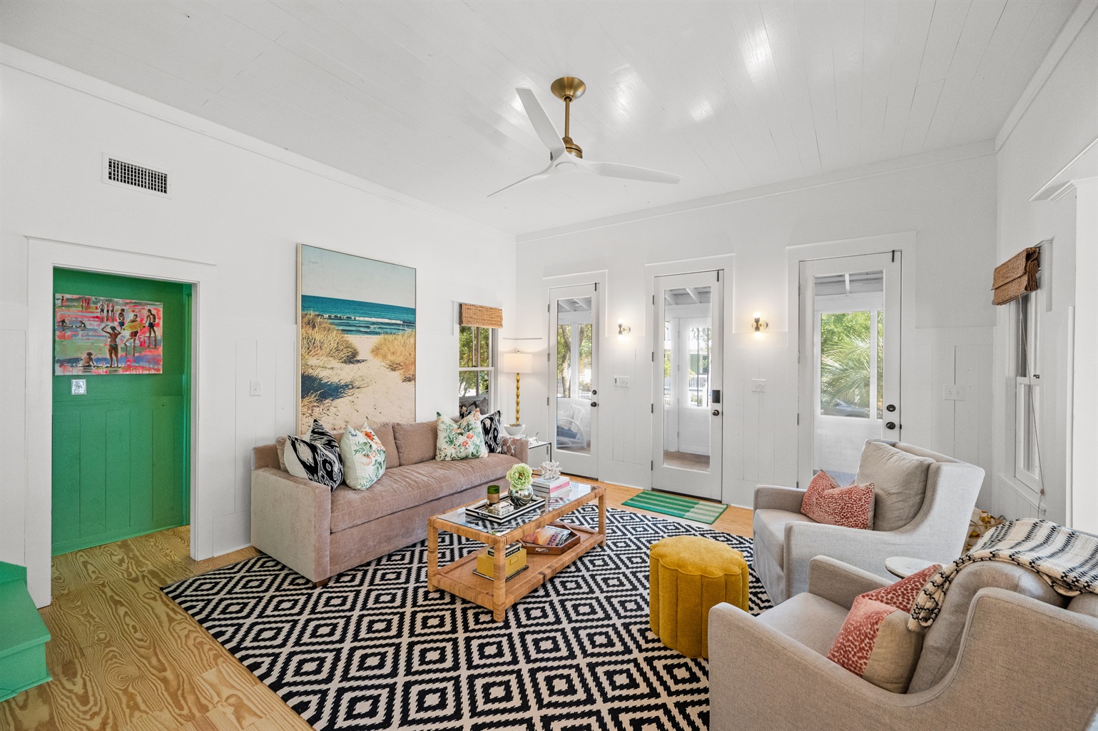 Bright coastal bunk room with built-in twin bunks—perfect for kids or extra guests.