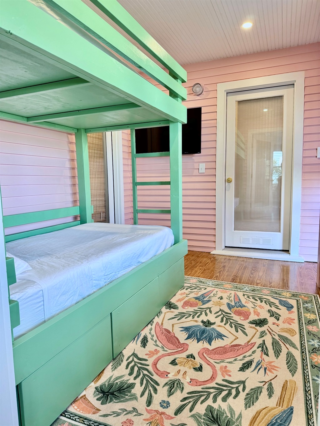 Bright coastal bunk room with built-in twin bunks and a wall-mounted TV—perfect for kids or extra guests.